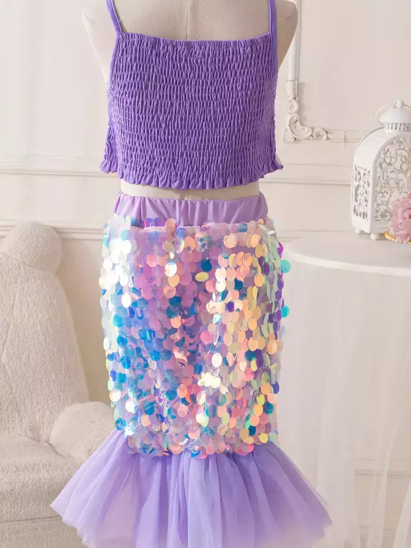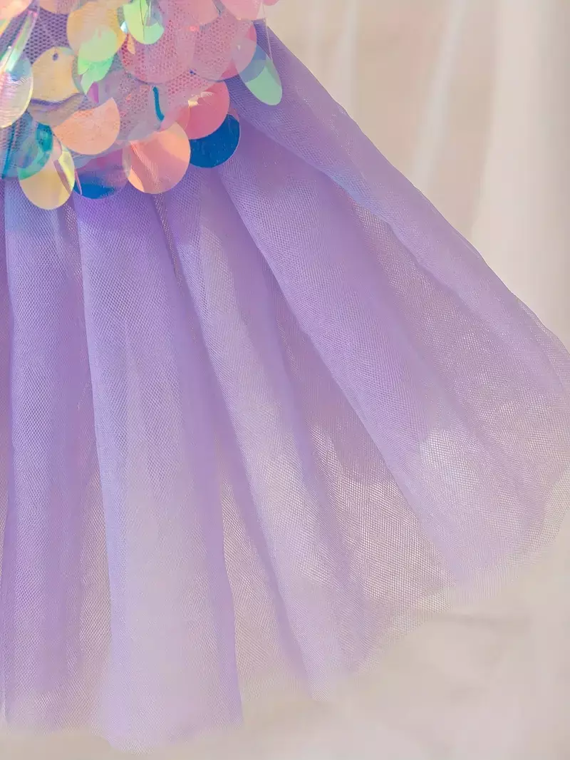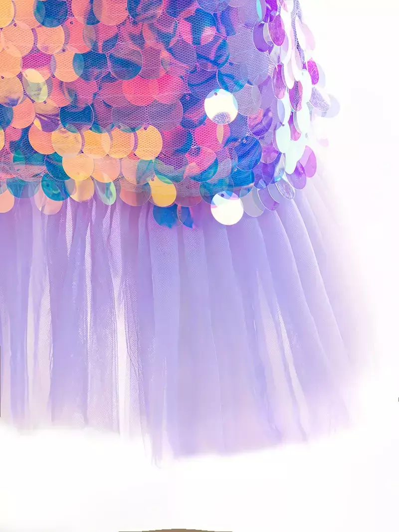 Falda de sirena con lentejuelas grandes e iridiscentes que simulan escamas brillantes. Terminación en tul lila tipo cola de sirena para un efecto de fantasía espectacular.