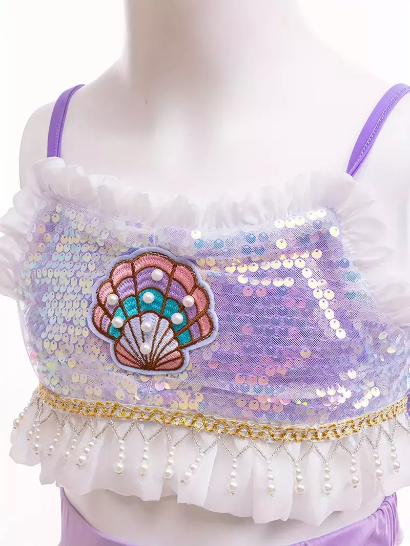 Top tipo crop en color lila con tirantes delgados, parte delantera decorada con lentejuelas tornasol y un coqueto bordado de caracola marina. La parte trasera tiene fruncido elástico para un ajuste cómodo y flexible.