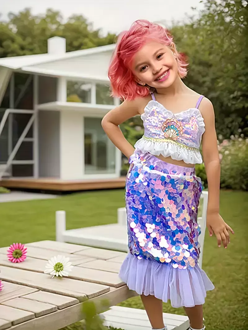 ¡Convierte a tu pequeña en una sirena mágica con este encantador conjunto de 2 piezas! Ideal para fiestas temáticas, cumpleaños, sesiones de fotos o simplemente para jugar a ser La Sirenita.